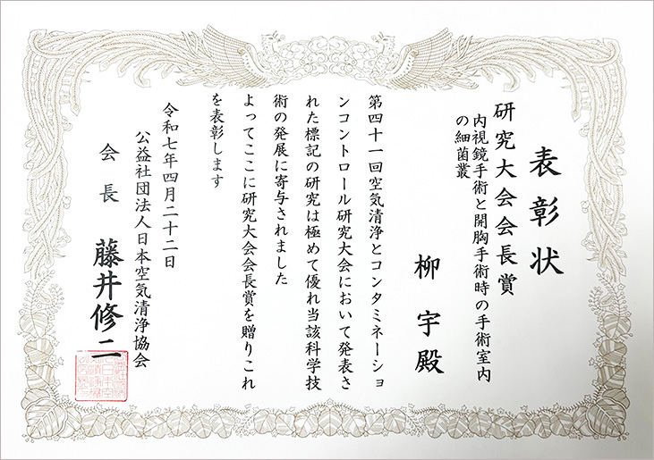 今回の受賞は、柳教授が発表した研究「内視鏡手術と開胸手術時の手術室内の細菌菌叢(単著)」に対して贈られたものです。