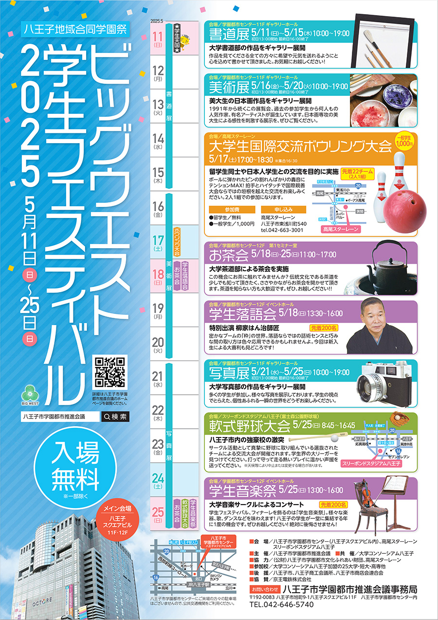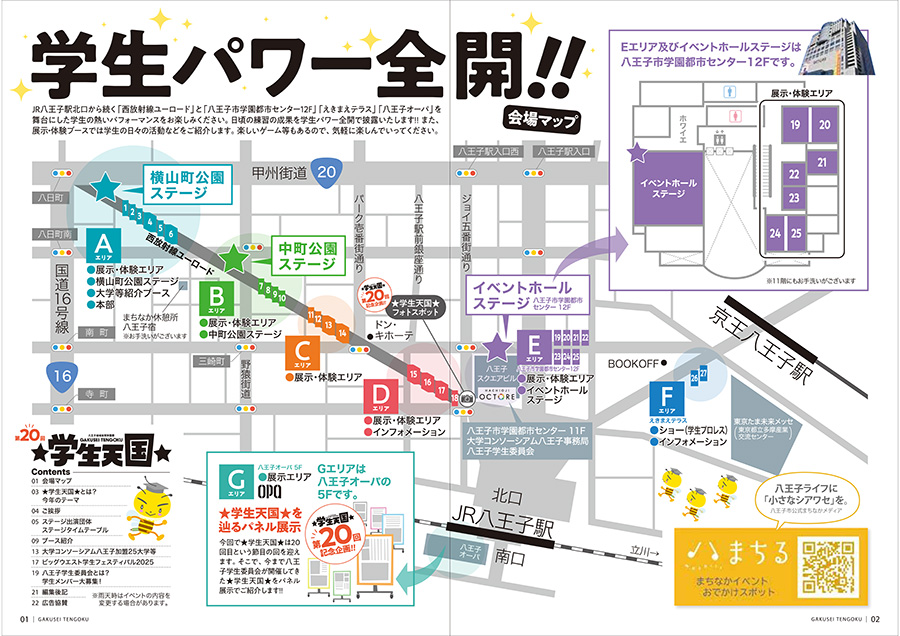 第20回の開催を迎える今回は、エリアの拡充に加え、謎解きラリーやゆるキャラクイズ大会など、来場者の皆さまにお楽しみいただける企画を数多く用意しました。 本学の学生団体に加え、大学コンソーシアム八王子加盟校による多彩な活動をご覧いただくことで、学園都市・八王子の一員としてのつながりを実感できる、貴重な機会となるはずです。 ぜひ会場に足をお運びいただき、にぎわいあふれる学生イベントの雰囲気をご体感ください。