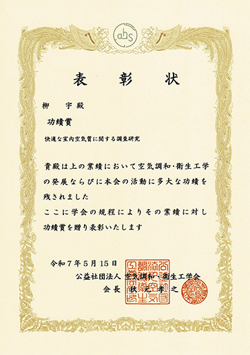 5月15日、柳宇教授(建築学科)が公益社団法人 空気調和・衛生工学会で功績賞を受賞しました。