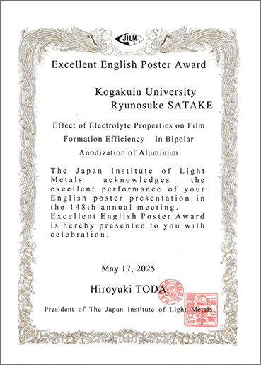 5月16日から18日に北九州国際会議場で開催された一般社団法人軽金属学会第148回春期大会のポスター発表において、化学応用学専攻修士2年の佐竹竜乃介さん(無機表面化学研究室・阿相英孝教授)が優秀英語ポスター発表賞を受賞しました。