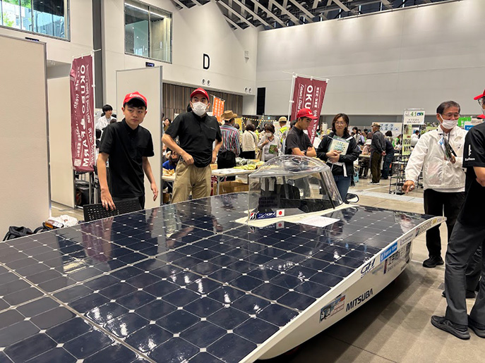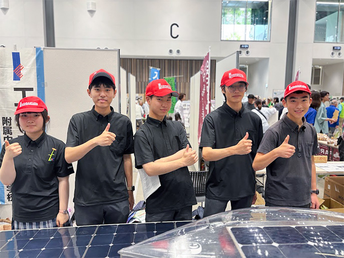 工学院大学附属中学校・高等学校自動車部は、ソーラーカーの車両展示と説明ブースに出展し、子どもから大人まで幅広い世代の方がソーラーカーに足を止め、部員との会話を通して、技術や活動内容に強い関心を寄せていました。