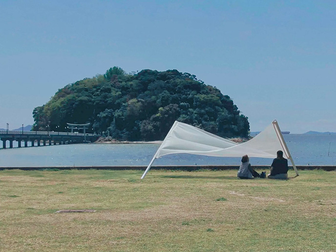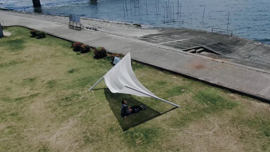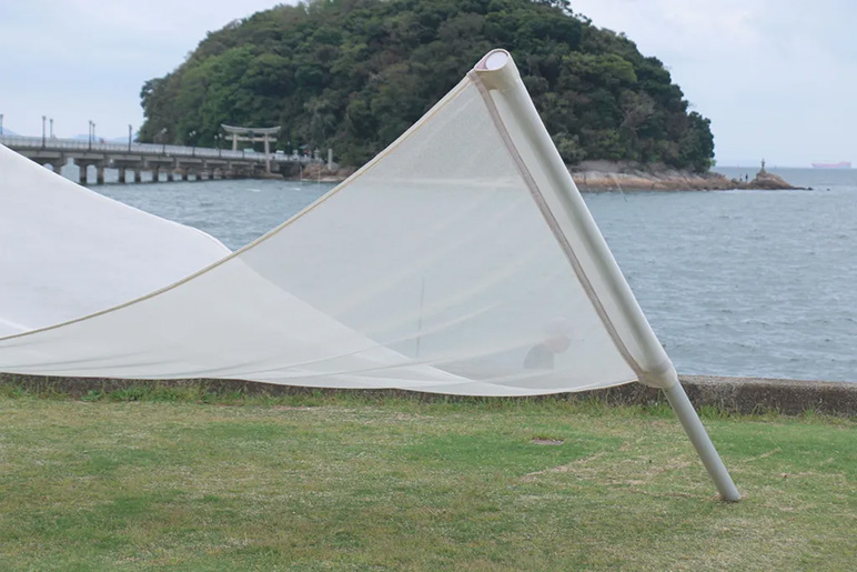 本作品のコンセプトは「腰掛け」ではなく、地面に直接身をゆだねる新しいかたちの居場所を提案しています。支柱から張られた天幕は海風にたゆたいながら、やわらかな日陰をつくり、身体ごと布の下に入ることで、風景と一体となるような自然とのつながりを感じる体験が生まれます。