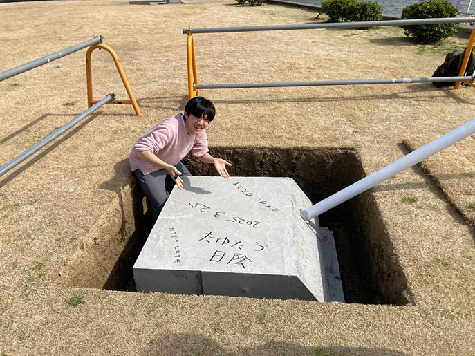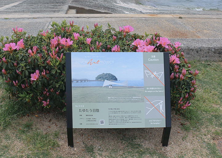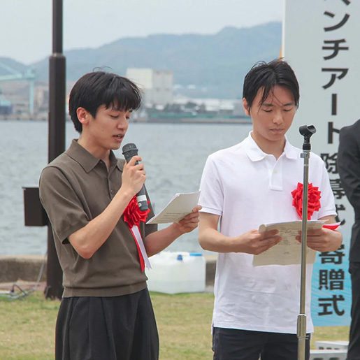 2024年9月に開催された「蒲郡BENCH ART PROJECT学生チャレンジコンペ2024」(主催:蒲郡ベンチアートプロジェクト委員会および蒲郡市)にて最優秀作品賞を受賞した、工学研究科建築学専攻修士2年の川口弘誠さん(樫原研究室・樫原徹教授)と大谷和之さん(鈴木敏彦研究室・鈴木敏彦教授)の作品「たゆたう日陰」がこのたび完成し、2025年4月22日に蒲郡市竹島町の竹島園地で除幕式が行われました。多くの関係者が見守る中、作品がお披露目されました。