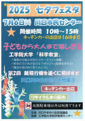 科学教育センターは、7月6(日)に開催される「2025 七夕フェスタ(川口やまゆり住民協議会主催、共催:工学院大学科学教育センター)」にて「科学教室」を実施します。