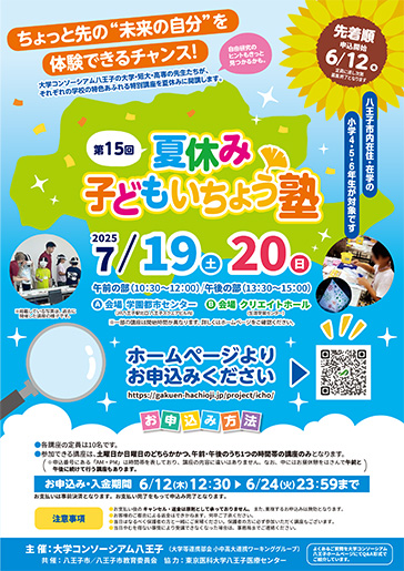 科学教育センターは、7月19日(土)・20日(日)に開催される「第15回 夏休み子どもいちょう塾」に出展します。本イベントは、大学コンソーシアム八王子(小中高大連携ワーキンググループ)が主催、八王子市および八王子市教育委員会が共催で開催されます。