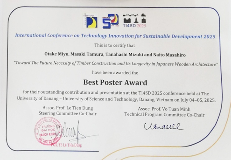 建築学科4年の尾竹美祐さん(田村研究室・田村雅紀教授指導)が、ベトナム・ダナン工科大学(The University of Danang–University of Science and Technology:DUT)の設立50周年を記念して開催された国際会議「The International Conference on Technology Innovation for Sustainable Development(IT4SD)」にて、「2025TI4SD国際会議 Best Poster Award」を受賞しました。