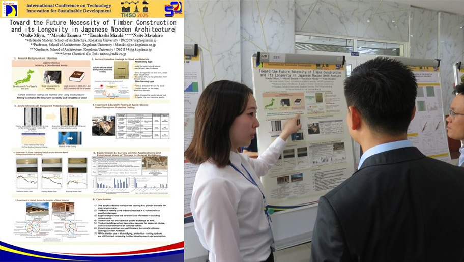 尾竹さんの論文は、木造建築部材の表面劣化・色彩退色を低減する技術に関するもので、産学連携による特許出願済技術(特願2019-239408)を含んでおり、今後の木材利用の推進に向けた社会実装が期待されます。