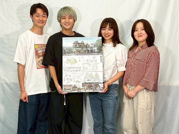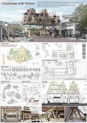 建築学専攻修士2年の亀井康平さん、塩田結さん、松尾香里さん、および建築学専攻修士1年の長谷川諒さん(ともに樫原研究室・樫原 徹教授)のグループによる作品「Coexisting with Nature」が、国際設計コンペティション「Galapagos Retreat 2025」(主催:IDOARCH)において三等賞にあたるEditor's Choice Prizeを受賞しました。