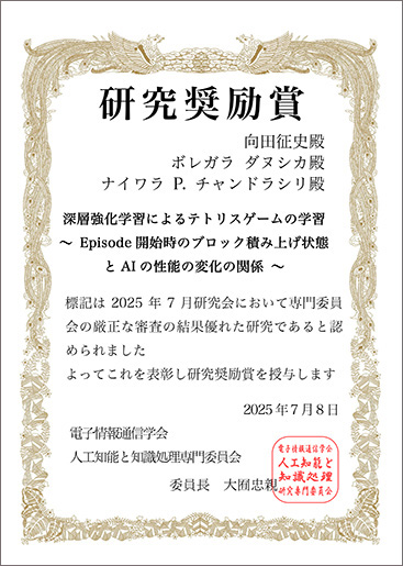 2025年7月8日、北海道で開催された電子情報通信学会 人工知能と知識処理研究会(AI)主催の 「SMASH25 Summer Symposium」において、情報学専攻修士1年の向田征史さん(知能メディア処理研究室・ナイワラ P. チャンドラシリ教授)が発表した研究が、研究奨励賞を受賞しました。