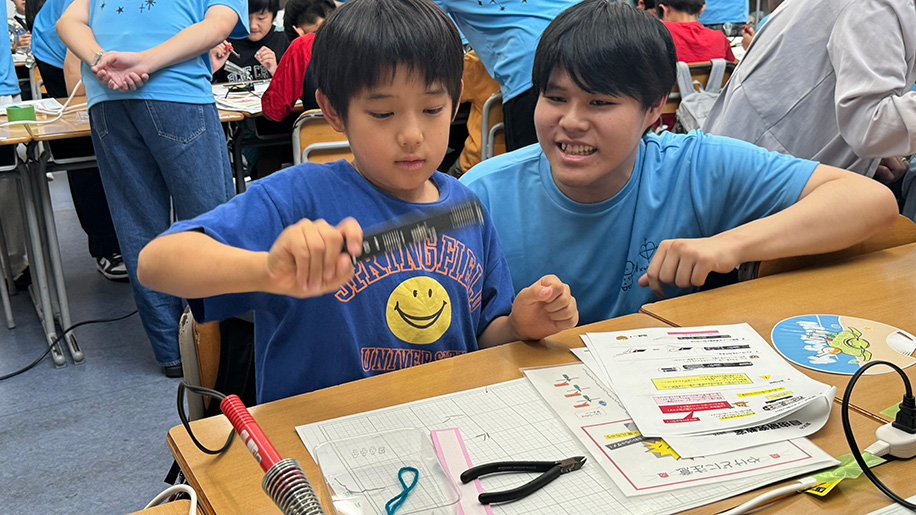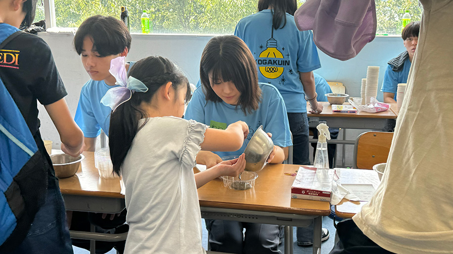 理工系分野を専門とする工学院大学の教授陣、大学生たちも運営に携わりました。手を動かし、楽しみながら科学の原理を体感できるワークショップを行いました。大学が主催する体験講座の一部には、附属中学校・高等学校の生徒たちがスタッフとして参加。事前に大学教員や大学生から専門知識や実技のレクチャーを受け、本番では子どもたちのサポート役として積極的に取り組む姿が見られました。