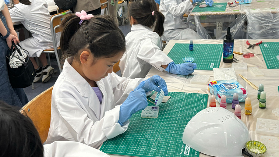 紫外線硬化樹脂を用いて、アクセサリー作り。身近な高分子素材の作製を通して、化学を体感しました。