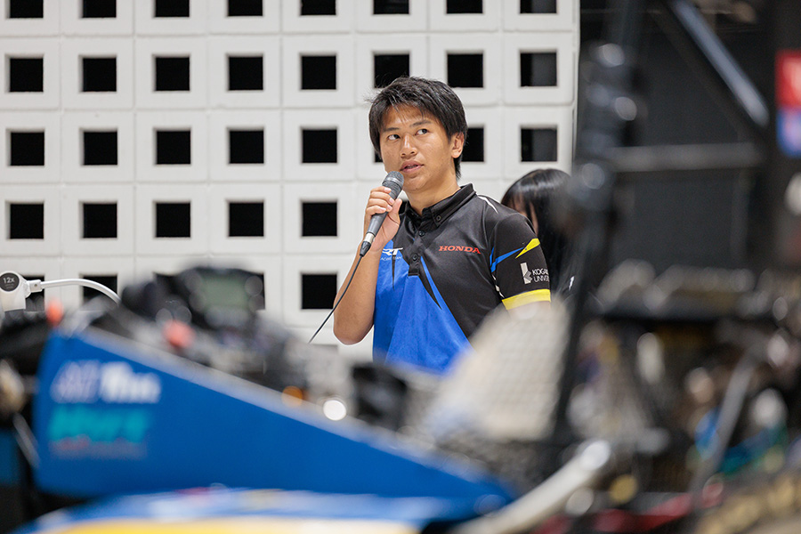 お披露目会には、サポート企業やメディア、学内関係者など様々な方が出席しました。はじめに今村学長からご来場の皆さまへの御礼と、学生たちへの激励の言葉が贈られました。続いてチームリーダーの松本悠暉さん(機械工学科3年)より今年の新車両「KRT25」の発表があり、各班から登壇したメンバーが、今大会に向けた改良ポイントを説明しました。