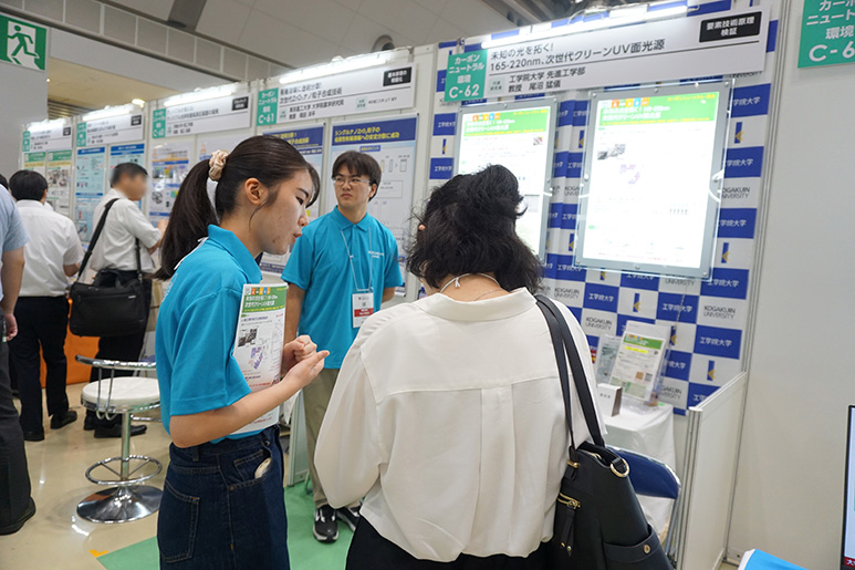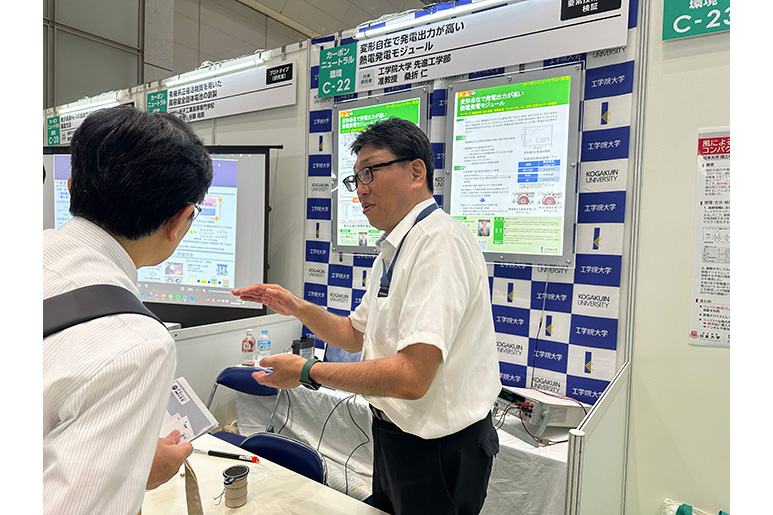 本学のブースでは、教授陣と研究室所属の学生たちが研究成果を紹介し、技術の独自性や社会実装への可能性について説明しました。積極的な声かけに多くの企業が足を留め、技術の具体的な活用方法に関する対話が活発に行われました。さらに、企業の課題や業界のニーズといった「現場の声」を直接聞くことができ、参加した学生たちは研究の新しい視点を得て、モチベーションを高めていました。