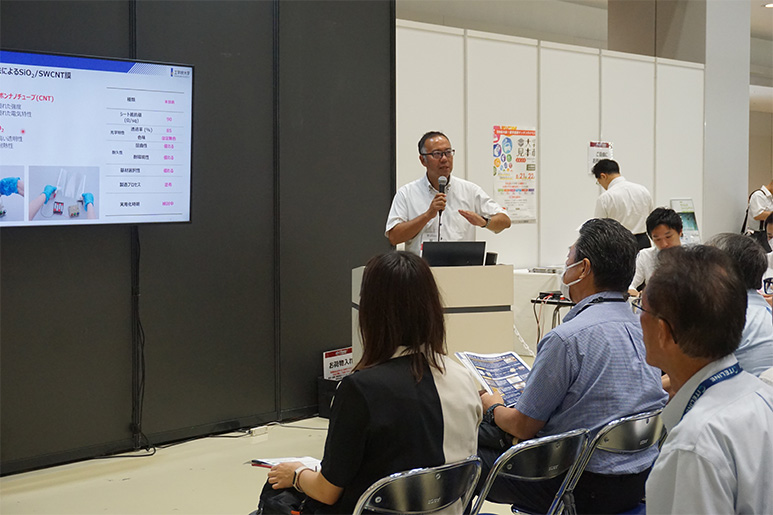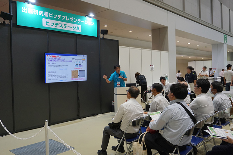 また、応用物理学科の尾沼 猛儀 教授、永井 裕己 准教授は「ピッチステージ」に登壇。5分間のスピーチで研究概要、社会的背景、先行技術との比較などについて説明しました。研究成果の意義や社会実装の可能性を力強く訴えかけ、聴講者の注目を集めました。