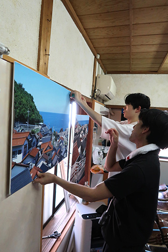 また壁面にはこれまでの小伊津訪問で学生が撮影した小伊津の写真を展示しました。各写真の水平線をそろえ、室内なのに海を見ているような空間をつくりました。