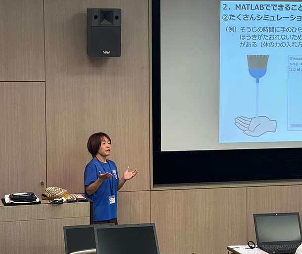 齊藤准教授は数値計算ソフトウェア「MATLAB」を使用した音楽ファイルの作成の講座を、米盛准教授は銅線、電池、ブザーを用いた「イライラ棒」の作成の講座をそれぞれ行いました。