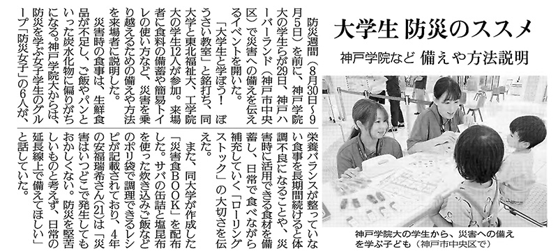 防災・減災教育センターは、8月29日(金)に神戸ハーバーランドumieで「大学生と学ぼう!ぼうさい教室」を開催しました。日本財団ボランティアセンターと共催し、TKK3大学連携(東北福祉大学、工学院大学、神戸学院大学)の取り組みの一環として行われました。