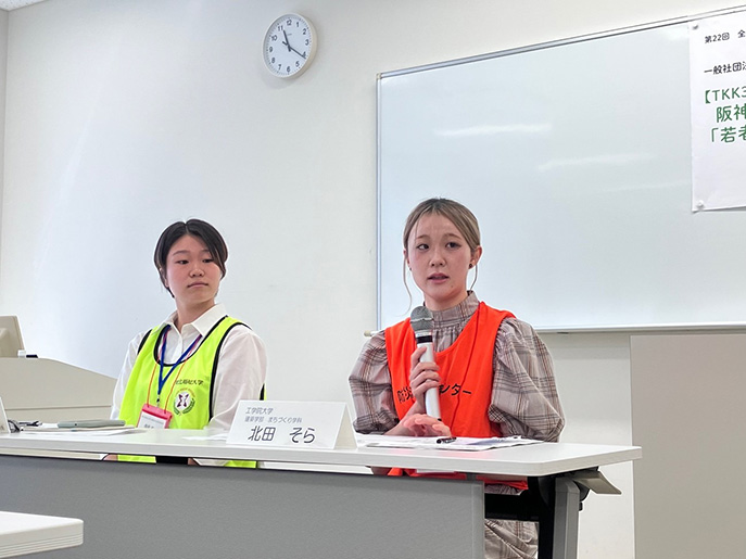 村上センター長からは「TKK3大学連携プロジェクト」の枠組みの共有や本学が東日本大震災の際に実施したボランティア活動について説明しました。北田さんは自身のゼミ活動で行なっている防災・減災に関わる活動や能登地震の被災地でのサロン活動を紹介しました。