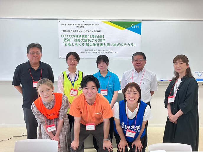 8月30日、31日に第22回全国大学コンソーシアム研究交流フォーラムの分科会にて協定締結15周年を記念したフォーラムを開催しました。『阪神・淡路大震災から30年「若者と考える 被災地支援と語り継ぎのチカラ」』をテーマに、本学からは村上正浩防災・減災教育センター長と建築学部まちづくり学科4年の北田そらさんが登壇しました。