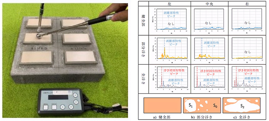 本技術は、外壁タイル診断において一般的に用いられる打診ハンマーを利用し、打診時の反発音を高速フーリエ変換により周波数データに変換し、そのピーク周波数と波動エネルギーを組み合わせて、タイルの接着状態の安全性を評価するものです。従来の打音検査法では、検査員が健全部と浮き部の音の差異を聴き分けて判定していましたが、定量化ができず判定精度にばらつきが生じる課題がありました。本技術はその問題を解決し、客観的かつ再現性の高い評価を可能にします。タイルの付着状態に関する特性も分析可能であり、既存建物の外壁診断の精度と信頼性を高めます。 外壁タイルを使用した建築物は国内に膨大に存在し、その安全性確保は社会的に重要な課題です。本技術は、従来の打音検査法が抱えていた検査員の聴覚依存によるばらつきを無くし、診断の客観性を高めることで、外壁タイルの剥落事故防止や維持管理の合理化に貢献します。