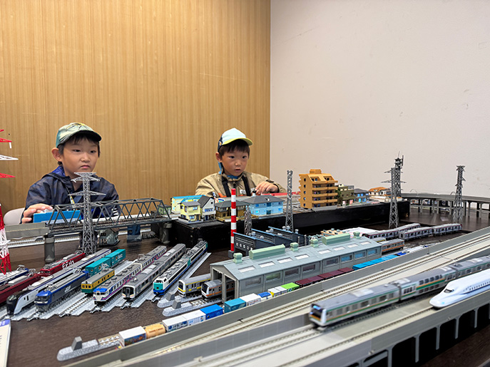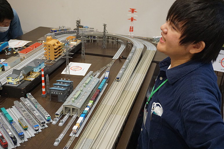 学生たちは鉄道模型(Nゲージ)運転体験コーナーを担当。八王子駅周辺を走る中央線など、子どもたちに人気の模型車両を用意しました。子どもたちへ運転の仕方を伝え、行中は自ら速度を調整しながら楽しそうに運転している様子がうかがえました。また、同伴する保護者からはジオラマの緻密さや車両が動く仕組みについて、多くの質問があり、模型をきっかけに鉄道の工学的な視点を伝え、鉄道を通じて学生と地域がつながる交流イベントとなりました。