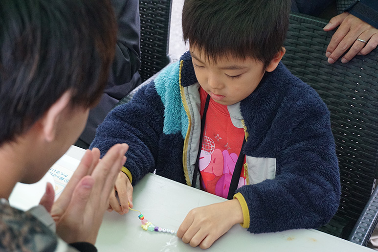 蓄光ビーズを使ってオリジナルのキーホルダーを制作し、停電時でもカバンや持ち出し袋の位置が分かるようにする工夫を紹介しました。また、アルファベットビーズで名前を入れることで名札としても活用できることを提案し、来場した子どもたちはものづくりを通じて、防災をより身近に感じてもらう取り組みとなりました。