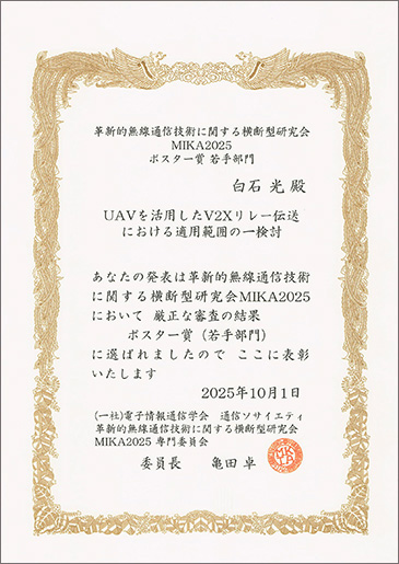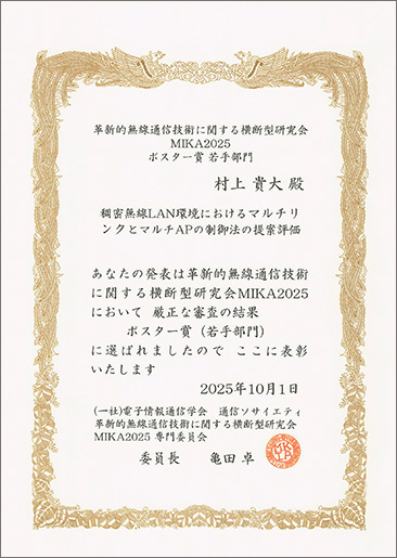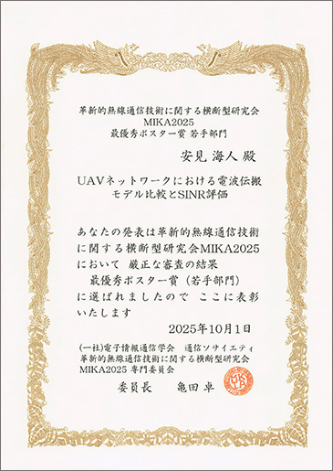2025年9月29日から10月1日に沖縄で開催された「電子情報通信学会 革新的無線通信技術に関する横断型研究会(MIKA2025)」において、本学から以下の学生および教員が、最優秀ポスター賞・ポスター賞をそれぞれ受賞しました。