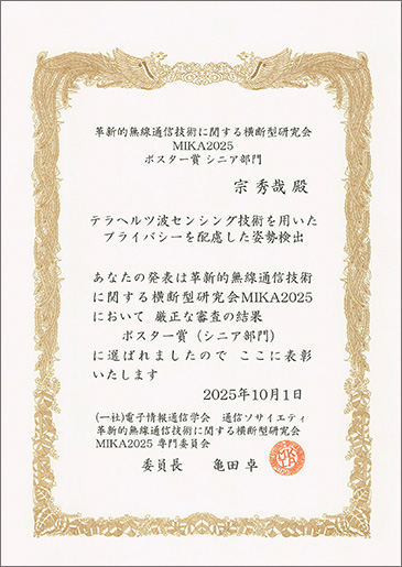 高齢化社会が抱える課題に対する一つの解決策として,テラヘルツ波センシング技術を活用した見守りシステムを提案し、その取り組みが評価されたことを大変光栄に思います。