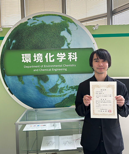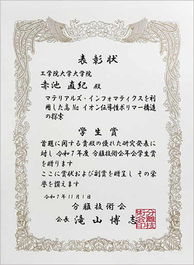 2025年10月31日、11月1日に日本大学駿河台校舎で開催された「分離技術会年会2025」において、化学応用学専攻1年の赤池直紀さん(環境算化学工学研究室・高羽洋充教授)が学生賞を受賞しました。