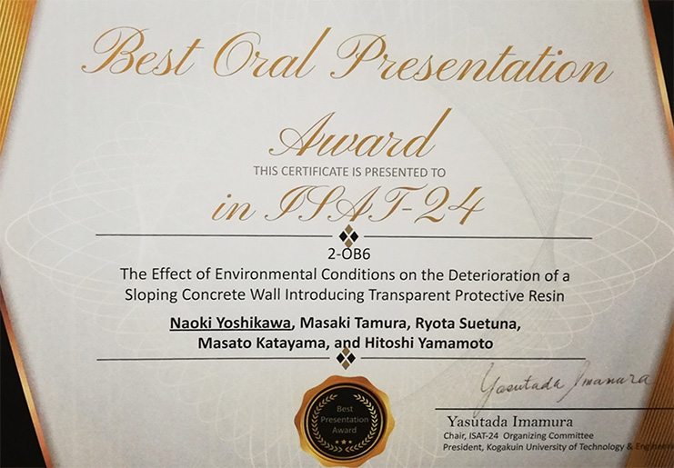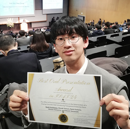 このたび、Best Oral Presenter Awardを賜り、誠にありがとうございます。論文のとりまとめに際しては、指導教員である田村先生をはじめ研究関連である日本樹脂施工協同組合の末綱龍太様、片山方人様、山本仁様を始め多くの皆様にご指導ご鞭撻を賜りました。この機会をお借りして御礼申し上げます。