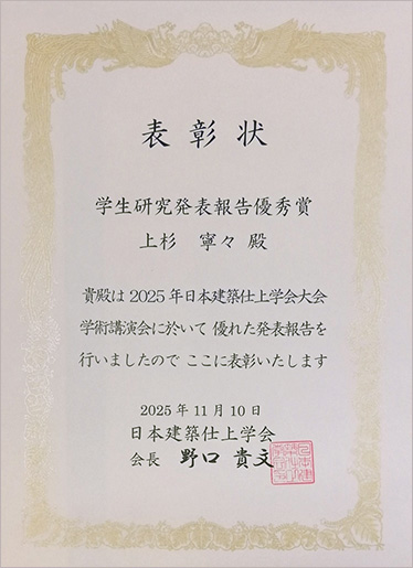 10月24日に開催された日本建築仕上学会 2025 年大会学術講演会にて、建築学専攻修士1年の上杉寧々さん(田村研究室・田村雅紀教授)が学生研究発表報告優秀賞を受賞しました。