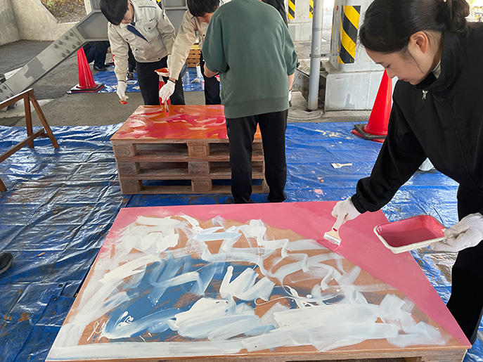 本ワークショップでは静岡市・JR草薙駅周辺の高架下スペースを活用し、賑わいの創出と駐輪問題を解決するため実施されました。ワークショップでは地元住民や企業が参加し、学生たちが組み立てたベンチや机にカラフルなペイントを施し、新たな交流空間を作り上げていました。