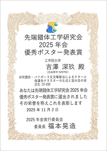 22025年11月2日に琉球大学で開催された先端錯体工学研究会2025年会において、化学応用学専攻修士2年の吉澤深玖さん(ナノ化学研究室・高見知秀教授)が優秀ポスター発表賞を受賞しました。