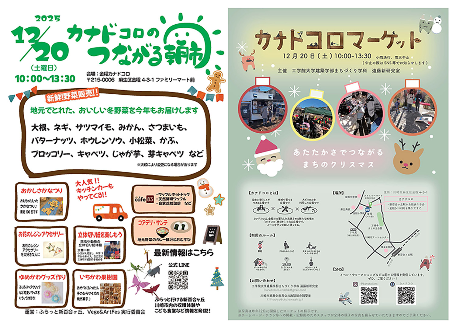 12月20日(土)、遠藤新研究室(まちづくり学科)は、川崎市との共同研究事業として整備された広場「カナドコロ」において、「カナドコロマーケット」を開催します。