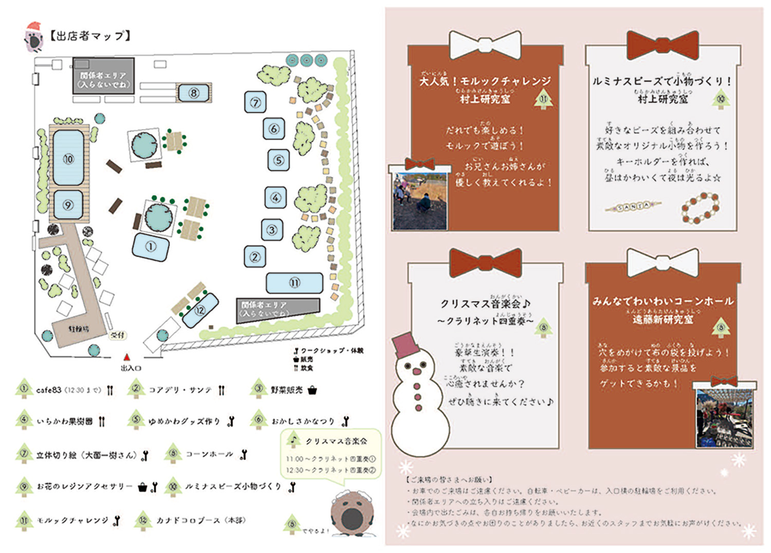 さらに、村上研究室(まちづくり学科)の学生たちとも協力して、クリスマスシーズンに合わせた企画を実施します。 モルックチャレンジやコーンホール、ルミナスビーズでの小物づくりなど、学生が企画・運営するミニゲームや体験コーナーを行うほか、クラリネット四重奏によるクリスマス音楽会を開催します。