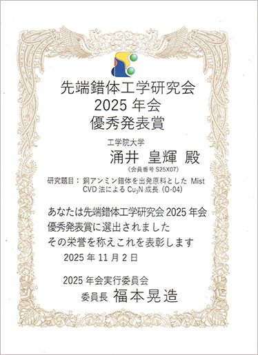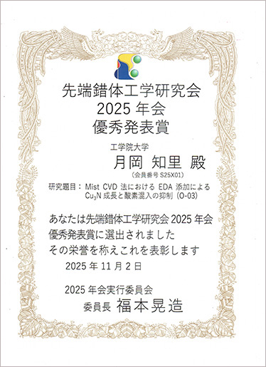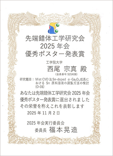 2025年11月2日に琉球大学の千原キャンパスで開催された先端錯体工学研究会2025年会において、電気・電子工学専攻修士2年の月岡知里さん、修士1年の涌井皇輝さんが優秀発表賞を、修士1年の西尾宗真さん(ともに結晶成長研究室・山口智広教授)が優秀ポスター賞を受賞しました。