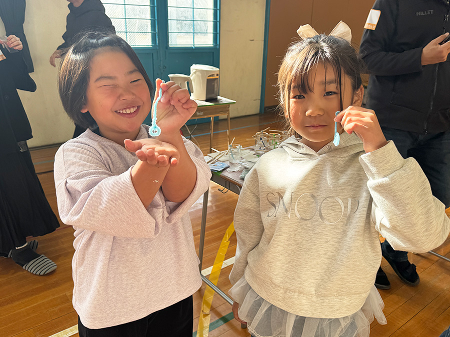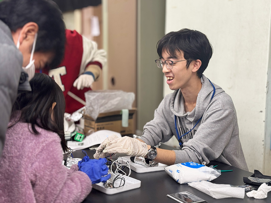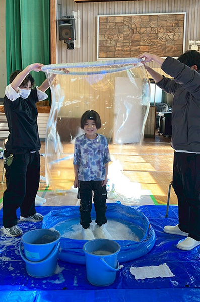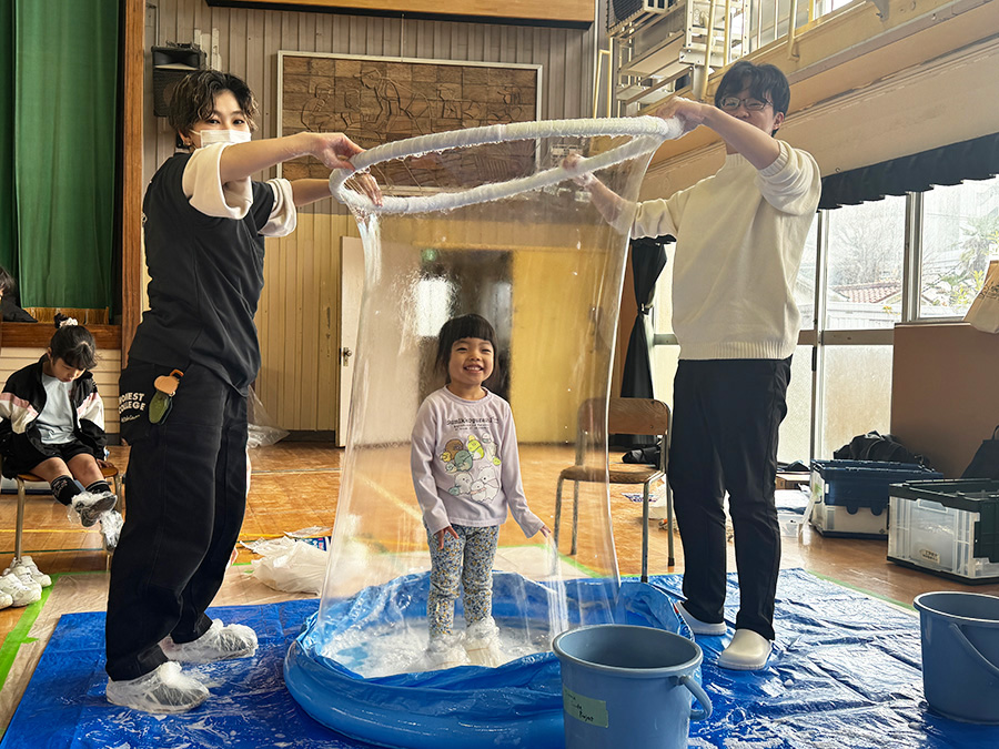 工作ブースでは、子どもたちが思い思いの色やデザインを自由に選びながら制作に取り組む姿が見られました。 体験ブースでは、巨大シャボン玉や燃料電池の体験が特に人気を集めました。 学生たちは子どもたち一人ひとりに寄り添いながら制作や体験をサポートし、活用している科学現象についても、分かりやすく説明しました。