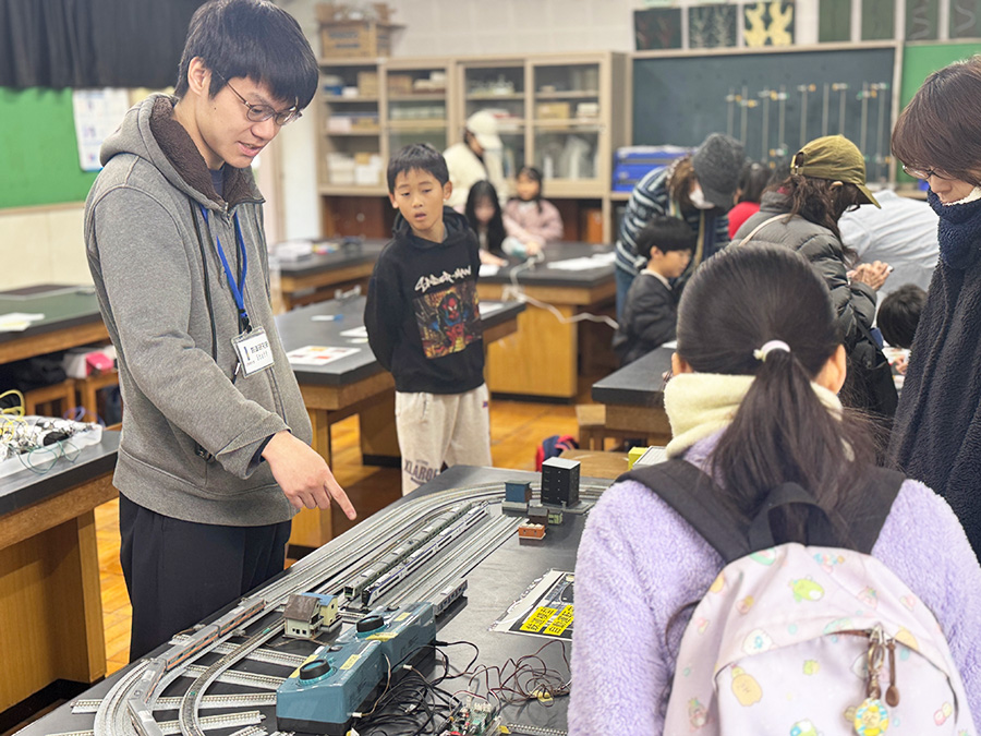 今年は、本学教員4名による演示テーマに加え、SCP、VRプロジェクト、鉄道研究部、木工学院の4つの学生団体が参加し、合計9つのテーマを展開しました。約100名の学生が運営に携わり、サポート役として本学の卒業生も参加しました。
