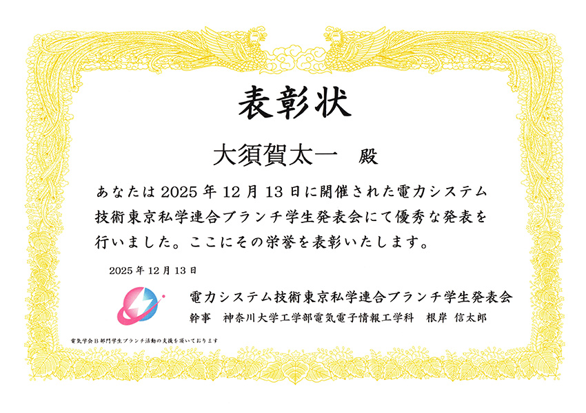 2025年12月13日(土)に神奈川大学横浜キャンパスで開催された「2025年電力システム技術東京私学連合ブランチ学生発表会」(電気学会B部門学生ブランチ活動の支援で実施)において、産業応用研究室(指導教員:米盛弘信 准教授)の学生9名が発表し、工学部電気電子工学科4年生の大須賀太一さんが「優秀発表賞」を受賞しました。