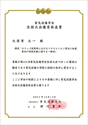 2025年8月28日(木)から29日(金)にかけて北海道科学大学で開催された「2025年(第43回)電気設備学会全国大会」において、産業応用研究室(指導教員:米盛弘信准教授)の学生8名が発表し、工学部電気電子工学科4年の大須賀太一さん(産業応用研究室 指導教員:米盛弘信准教授)が「全国大会優秀発表賞」を受賞しました。