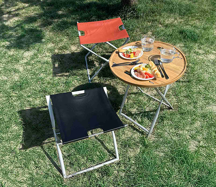 本作品では、リサイクル率の高いアルミニウム合金を素材に使用。多軸NC旋盤による切削加工技術で24mmのアルミの丸棒をプロペラ形状に精密に削り出し、革の座面と組み合わせてスツールにしました。リビングや庭で使った後は、折りたたんでおけば場所をとりません。使い勝手が良く、高級感のあるスツールです。