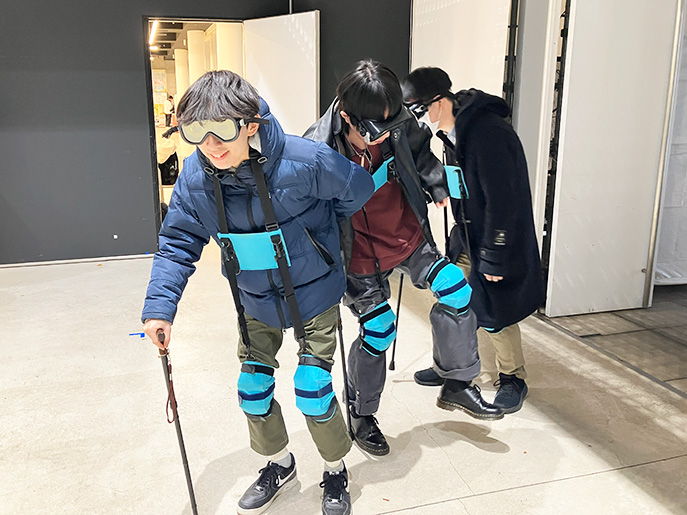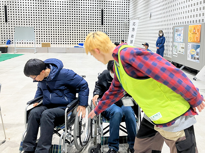 東北福祉大学は、車椅子を使った避難体験や高齢者疑似体験キットを用い、災害時に避難が困難になりやすい方の立場に立って対応を考える体験を行いました。