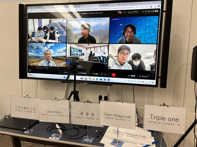 本コンテストは、本学がサイトライセンス契約を結んでいるMathWorks社のソフトウェア「MATLAB」を活用し、スマートフォンであらかじめ取得したセンサーデータの解析および機械学習モデルの精度を競うものです。当日は北見工業大学とリモートで会場をつなぎ、両校あわせて5チームがモデル作成とプレゼンテーションに取り組みました。