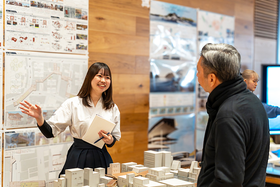 卒業制作にあたっては、たくさんの先生に親身に向き合っていただき、丁寧な助言をいただけたことが大きな支えとなりました。特に、指導教員の冨永先生からは、自分では気づいていなかった作品の良さを客観的に示していただきました。その言葉が、自身の制作に対する理解を深めるきっかけとなり、最終プレゼンテーションにも大いに生かされたと感じています。 工学院大学建築学部では学生同士のコミュニケーションが活発で、研究室の垣根を越えた交流や、互いに刺激を受けながら切磋琢磨できる環境があります。そうした日々の積み重ねが、最後まで制作に向き合う原動力となりました。 大学院進学後は、卒業制作を通じて芽生えた都市への関心をさらに深め、より広い視点から建築やまちづくりに向き合っていきたいと考えています。