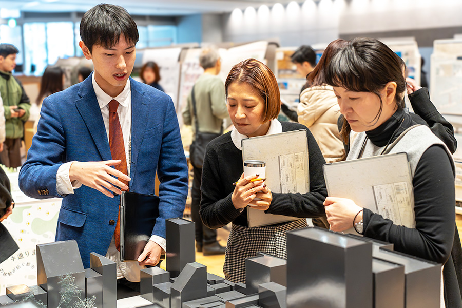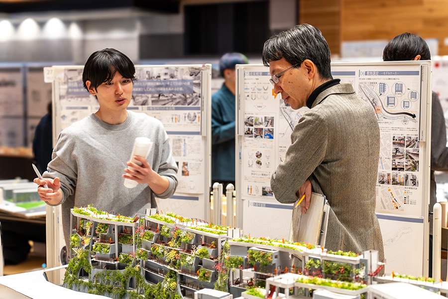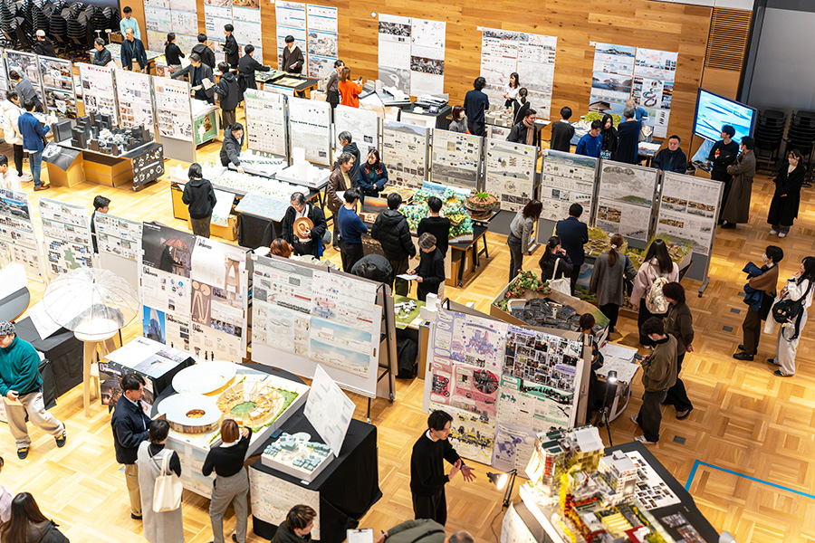 建築学部卒業研究制作審査会は、設計テーマをはじめ、建物の内容・立地・規模に至るまでを学生自身が設定し、約1年をかけて一つの作品と向き合う、学部4年間の学びの集大成となる取り組みです。