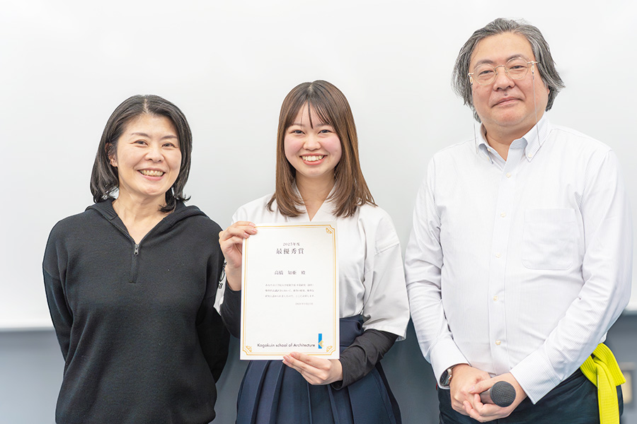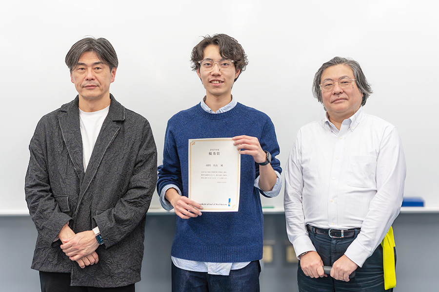 これまでリサーチを重視しながら作品制作に取り組んできましたが、審査では「現実味がある」「提案として成立している」と評価をいただき、大きな励みになりました。ノンフィクションの視点から建築を考えるという関心を、今後も大切にしていきたいと考えています。 卒業後は大学院へ進学し、さらに視野を広げながら、新たな建築の可能性を探っていきたいと考えています。