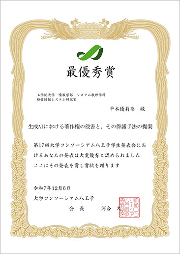 2025年12月6日に八王子市学園都市センターで開催された「大学コンソーシアム八王子学生発表会」において、情報学部システム数理学科4年の平本優莉奈さん(経営情報システム研究室・三木良雄教授)がポスター発表部門で最優秀賞を受賞しました。