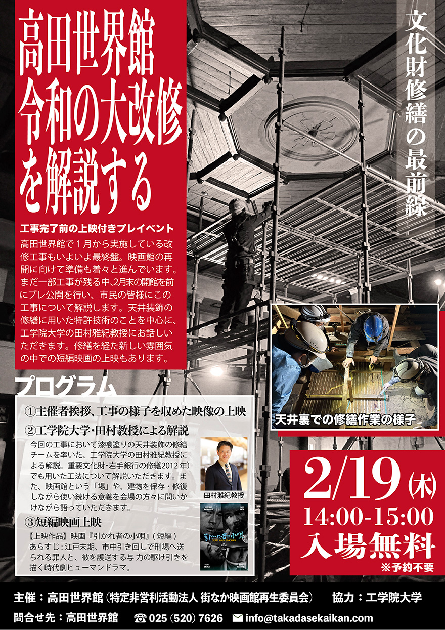2月19日(木)、新潟県上越市の高田世界館にて、同館で進められてきた大規模改修工事をテーマとしたトークショーを開催します。