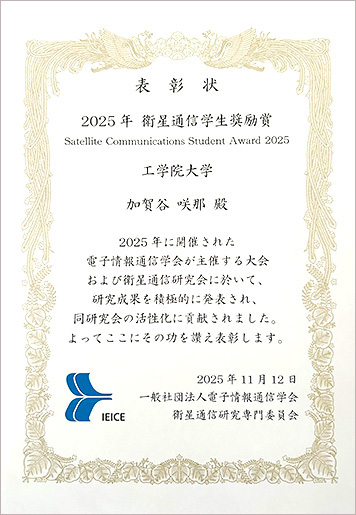 2026年2月10日に沖縄・久米島で開催された電子情報通信学会衛星通信研究会において、電気・電子工学専攻修士2年の加賀谷咲那さん(アクセスネットワーク研究室・杉山隆利教授)が2025年衛星通信学生奨励賞を受賞しました。