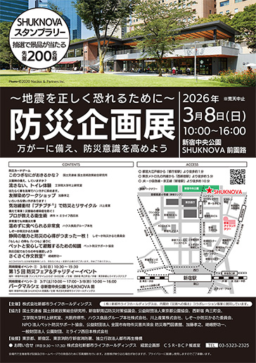 同日、新宿中央公園水の広場にて「防災フェア&チャリティイベント」も開催されます。防災の備えを考えるきっかけとして、ぜひお立ち寄りください。